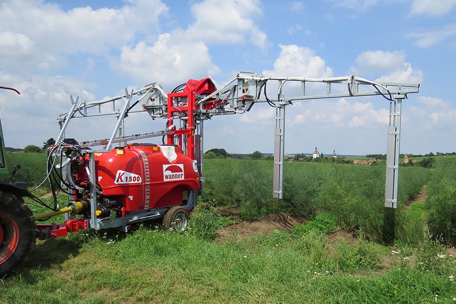 Mit unserem Spargelaufbau für 5 Reihen definieren wir Schlagkraft neu. Die Ausleger werden für den Straßentransport seitlich geklappt und für ein schnelles Vorgewende in die Höhe gehoben. Alle Düsenstäbe sind durch Federstäbe gegen Bruch bei Kollisionen abgesichert. Optional ist ein Lift für die Höhenverstellung lieferbar. Auch bieten wir den Anbau an der Gerätefront, um größere Reihenabstände realisieren zu können.